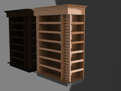 An attractive end-of-aisle slatwall display. It draws attention to itself with crown molding and hardwood trim. Fully customizable.